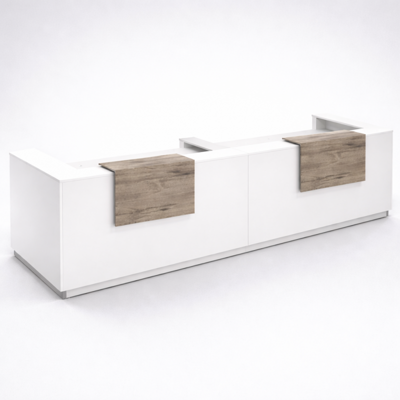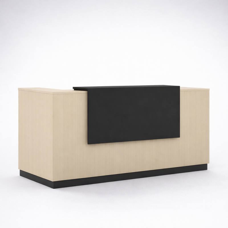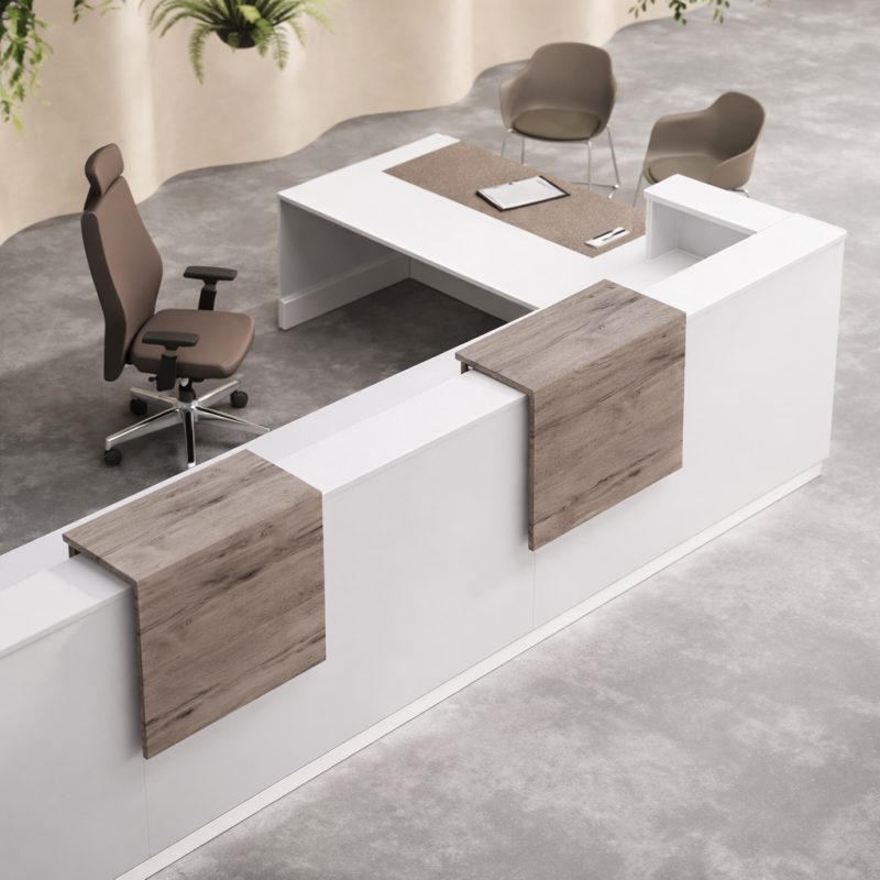 Grâce à ses plateaux rehaussés, ses panneaux robustes et sa colonne de renfort en acier, cette banque accueil design premium allie ergonomie, stabilité et personnalisation des finitions.
