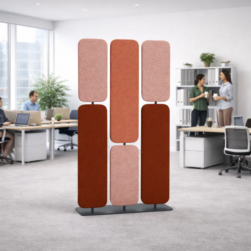 Disponible en plusieurs configurations, cette cloison acoustique autoportante peut être composée de 3 ou 6 panneaux rotatifs, selon le niveau de séparation souhaité. La possibilité de combiner différents coloris permet de créer une cloison acoustique décorative forte visuellement, tout en conservant une cohérence avec l’aménagement intérieur et l’identité graphique des espaces.