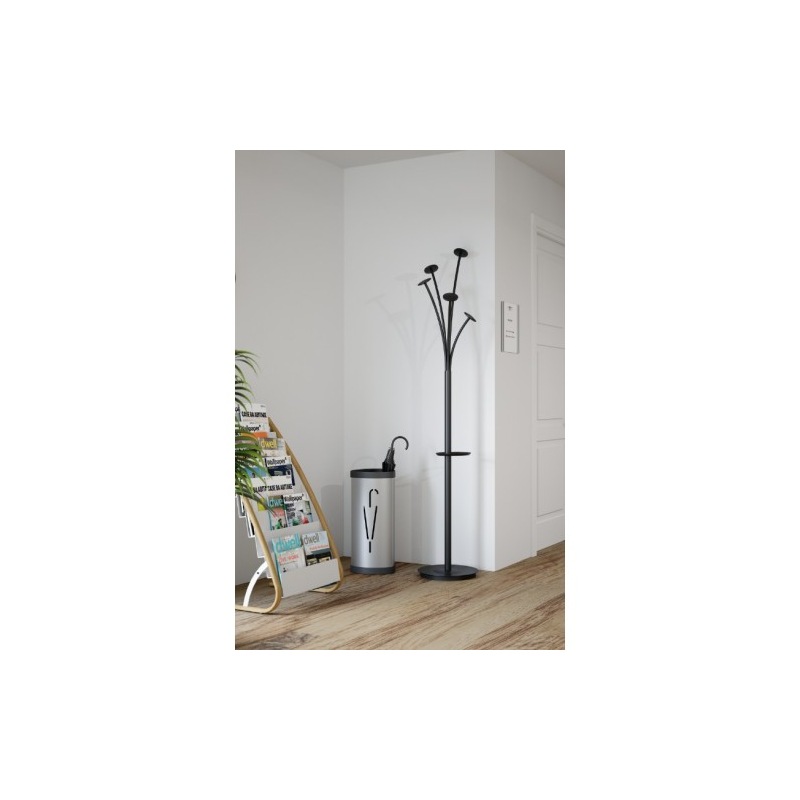 Sa tête supérieure comprend 5 patères ergonomiques pour suspendre manteaux, vestes ou écharpes sans les froisser, tandis que le porte-parapluies intégré permet de ranger jusqu’à 6 parapluies.
