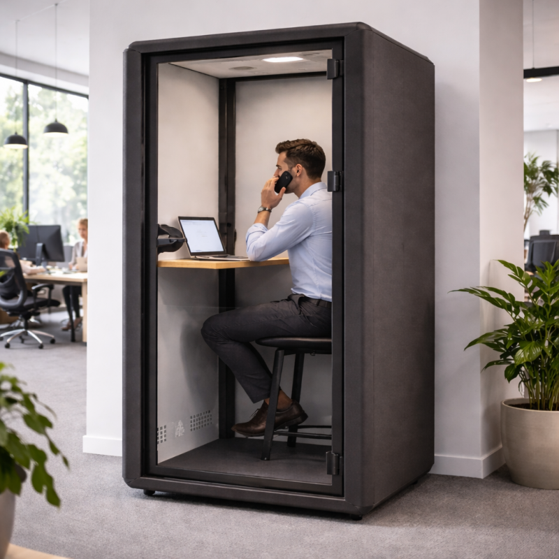 Cette cabine acoustique professionnelle est conçue pour offrir une isolation phonique de très haut niveau dans les open spaces, bureaux modernes et environnements de coworking. Véritable solution de cabine insonorisée de bureau, elle crée un espace de calme idéal pour la concentration, les appels privés, les visioconférences et les réunions confidentielles.