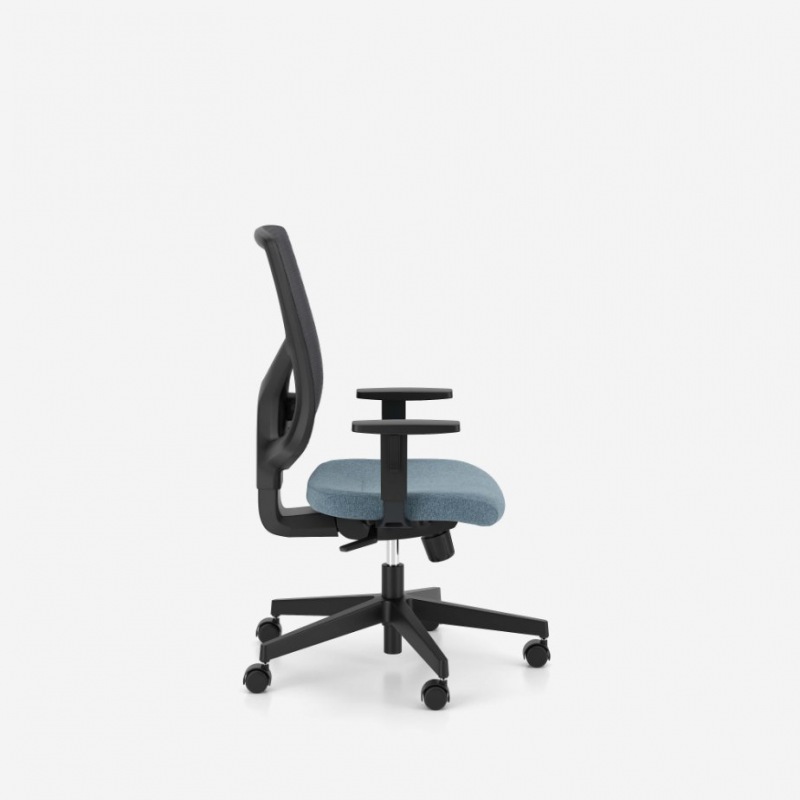 Son assise bleue apporte une touche de dynamisme tout en conservant une esthétique professionnelle. Le piètement noir renforce le caractère sobre et élégant du siège, facilitant son intégration dans tout type de bureau professionnel.