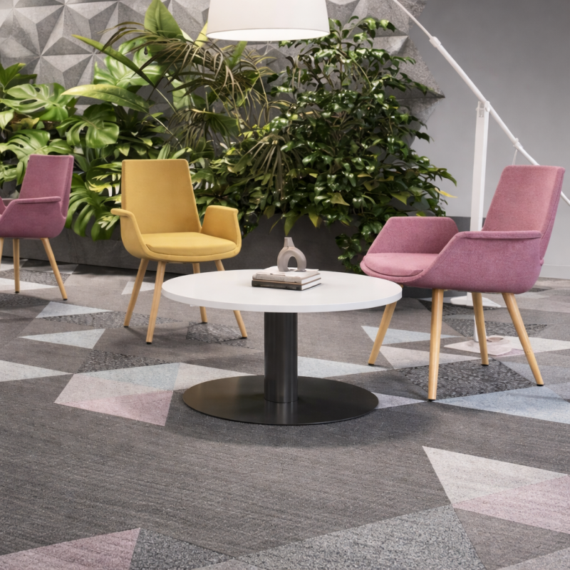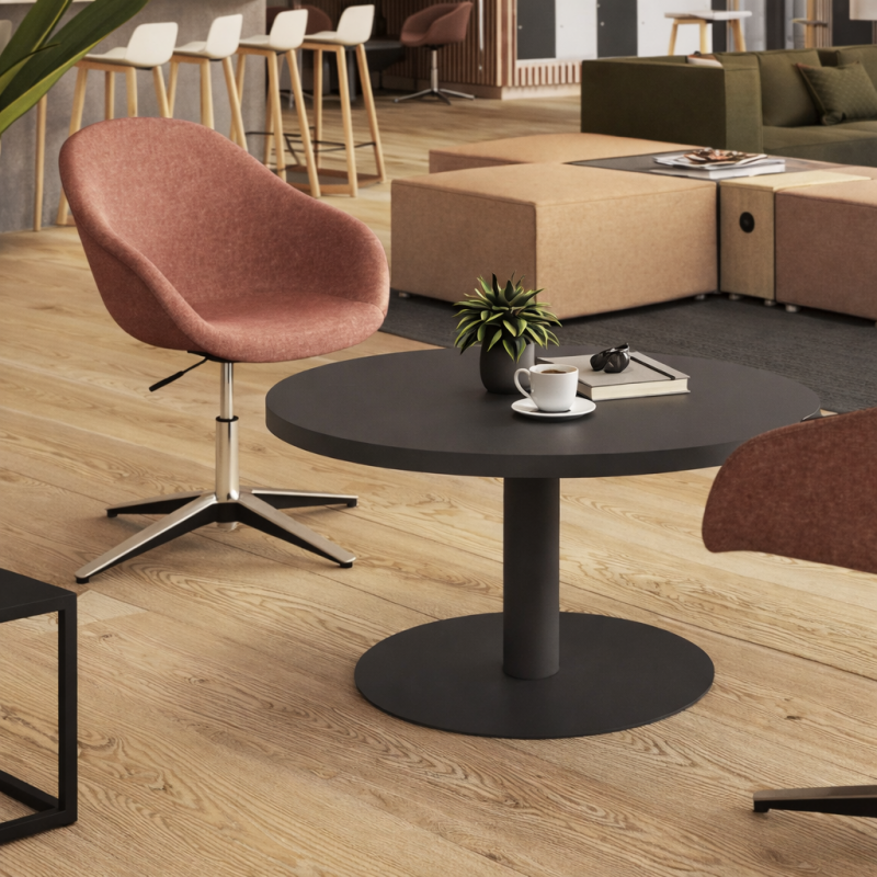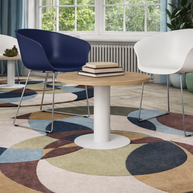 Le plateau rond favorise la circulation autour du mobilier et permet de structurer facilement un espace lounge ou salle d’attente moderne.